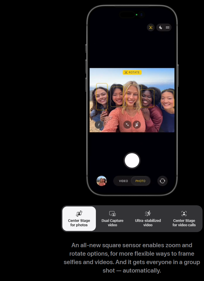 새로운 전면 카메라로 사진과 동영상을 더욱 유연하게 촬영할 수 있습니다. 탭 한 번으로 시야각을 넓히고, 아이폰을 움직이지 않고도 세로 모드에서 가로 모드로 회전할 수 있습니다. 친구들이 함께 촬영에 참여하면 시야각이 확장되어 더 많은 친구들을 셀카에 담을 수 있습니다.
